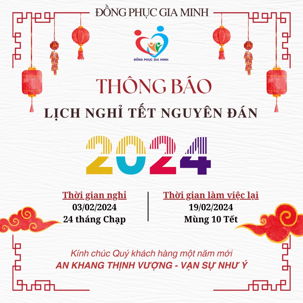 Đồng Phục Gia Minh xin trân trọng thông báo tới Quý khách hàng lịch nghỉ Lễ Tết Nguyên Đán 2024 như sau: Thời gian nghỉ: Từ ngày 03/02/2024 (nhằm 24/12 âm lịch) đến hết ngày 18/02/2024 (Mùng 9 âm lịch) Thời gian trở lại làm việc: Ngày 19/02/2024 (Mùng 10 âm lịch) Đồng Phục Gia […]