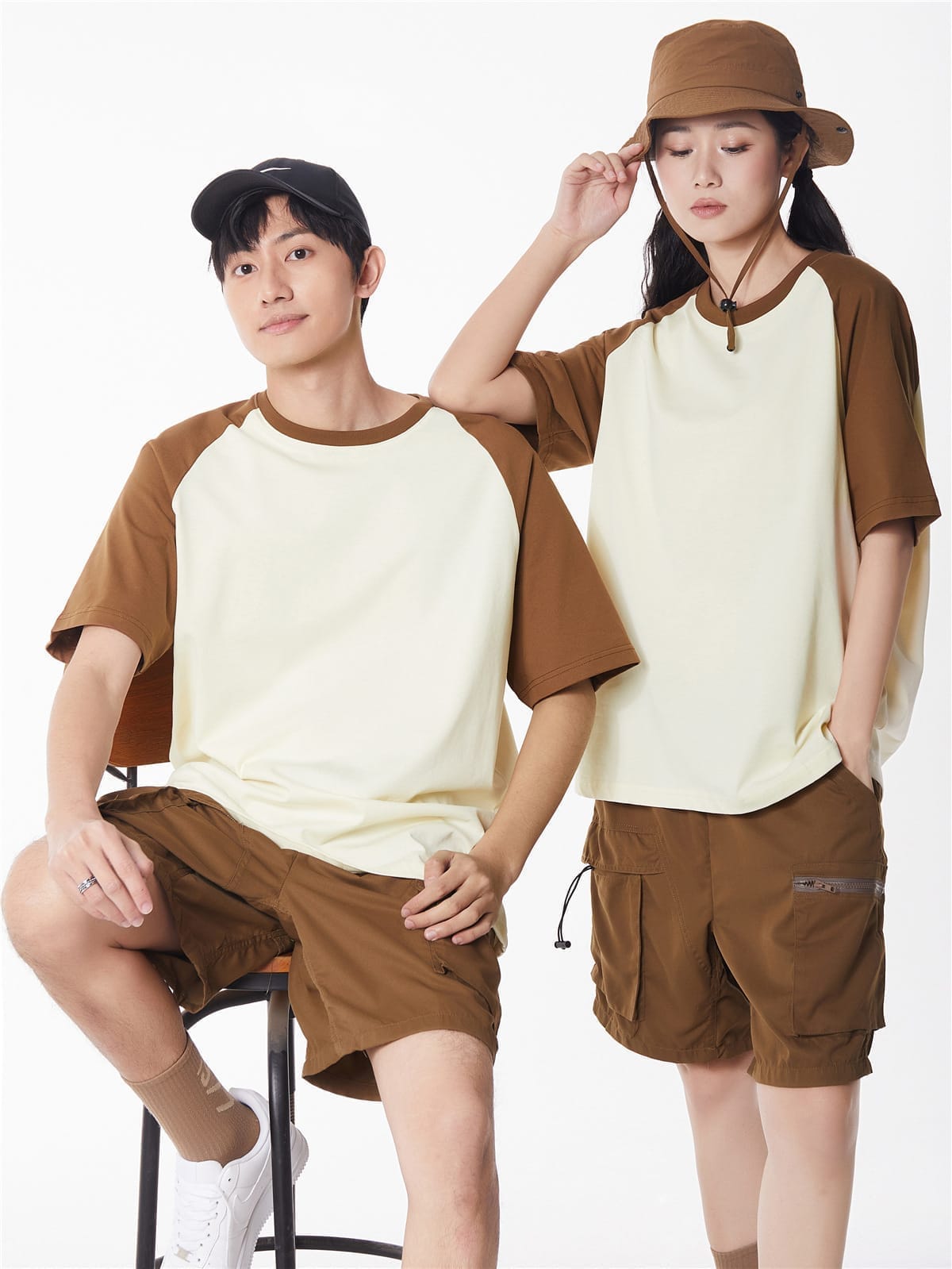 Kiểu dáng raglan đặc trưng với đường may chéo từ cổ xuống nách tạo sự khác biệt so với áo thun truyền thống. Thân áo màu be nhẹ nhàng, thanh lịch kết hợp với tay áo màu nâu (chocolate brown) tạo điểm nhấn ấn tượng và cá tính. Thiết kế này không chỉ mang lại vẻ ngoài trẻ trung mà còn giúp tôn dáng hiệu quả, đặc biệt phù hợp với xu hướng thời trang GenZ.