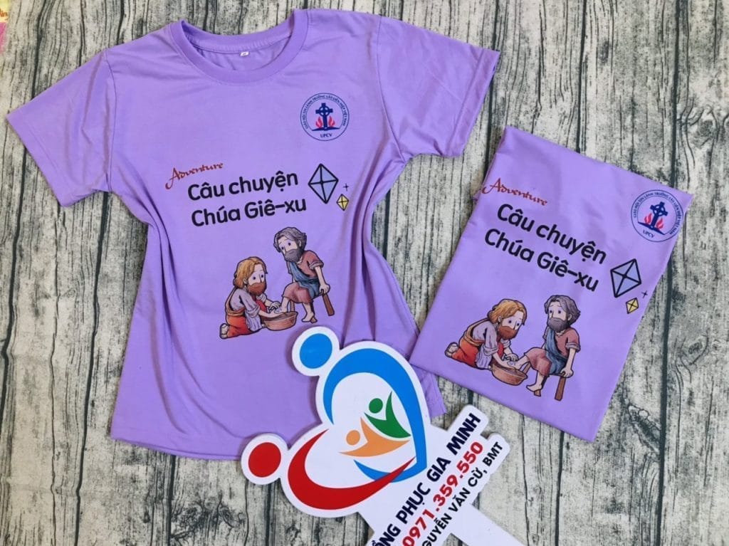 Áo có màu tím nhạt, tạo cảm giác nhẹ nhàng và thanh lịch, phù hợp với phong cách trang trọng nhưng vẫn trẻ trung. Trên áo là hình ảnh minh họa câu chuyện về Chúa Giê-su cùng dòng chữ “Câu chuyện Chúa Giê-xu” được in rõ nét, giúp truyền tải thông điệp ý nghĩa một cách trực quan. Góc trên bên phải có logo của tổ chức, giúp tăng tính nhận diện và khẳng định tính độc quyền của mẫu áo này. Chất liệu vải thoáng mát, đường may tỉ mỉ, đảm bảo sự thoải mái cho người mặc khi tham gia các hoạt động dài hơi.