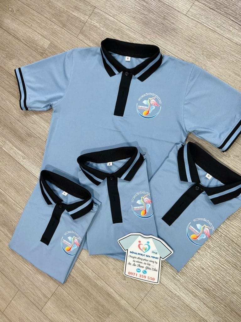 Mẫu áo đồng phục Tin Lành trong hình trên mang thiết kế hiện đại và tinh tế. Áo được làm từ chất liệu cao cấp với màu xanh nhạt dịu mắt, tạo cảm giác nhẹ nhàng và gần gũi. Cổ áo được phối màu đen, tạo điểm nhấn mạnh mẽ và làm nổi bật trên nền xanh. Cổ áo kiểu polo được phối viền hai sọc đen song song, làm tăng thêm phần thanh lịch và trang trọng cho người mặc. Phần viền tay áo cũng được thiết kế với hai đường kẻ sọc đen, tạo sự hài hòa và cân đối với cổ áo.